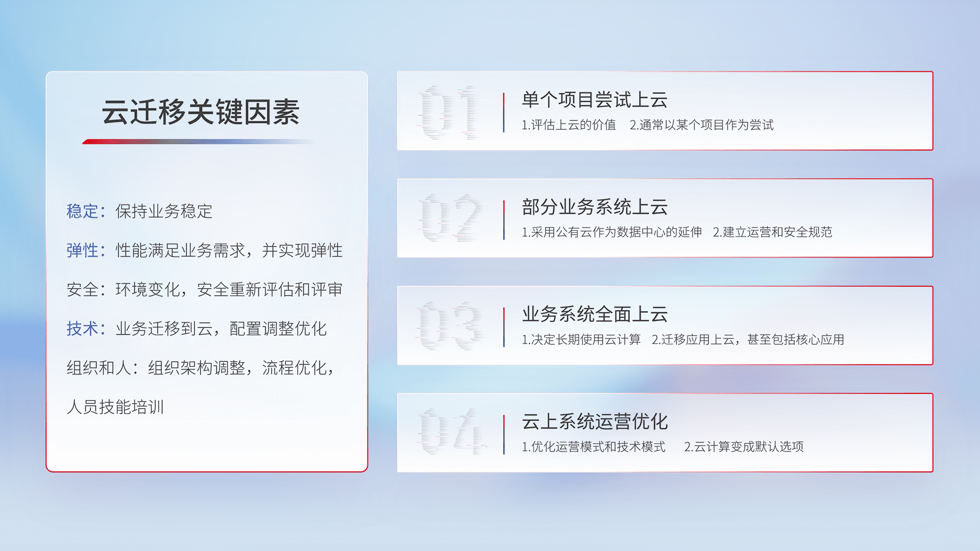 结合实际业务,,从规划设计、、、云平台选型、、、云原生改造、、数据迁移、、集成交付,,迁移全过程为客户识别最佳上云路径,,,做好风险识别管理,,,设计网络架构、、、、身份权限、、、、安全审计合规、、操作审计、、、、日志审计、、监控告警策略、、、、多站点容灾设计等,,对云上基础设施进行整体规划,,,提升IT治理水平,,,以满足弹性、、高可用、、高性能的需求。。。
