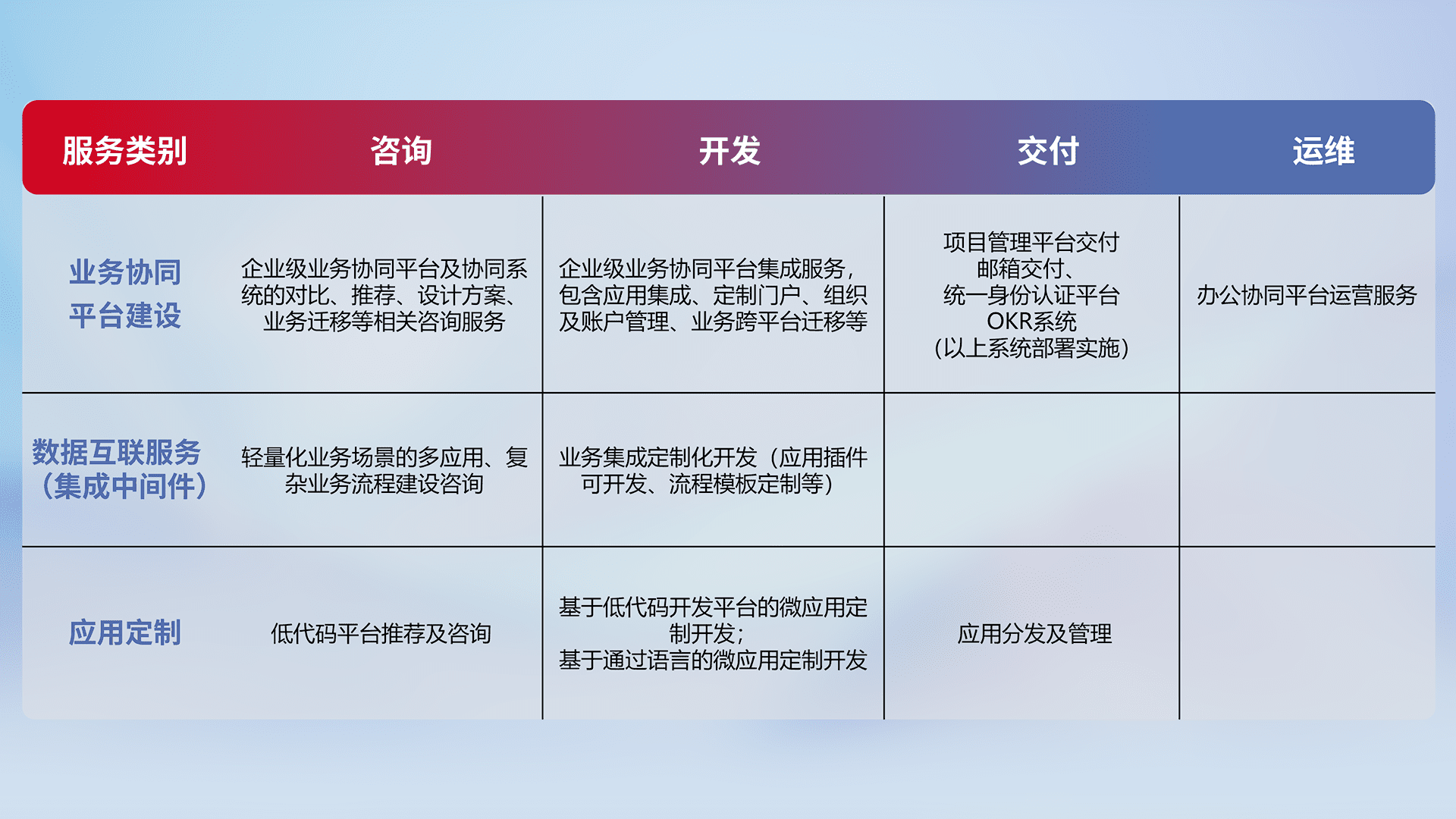 针对钉钉、、、企微、、、IDaas等平台级产品提供产品的规划、、方案、、、、交付、、、定制化开发等服务,,实现如统一协同办公、、智能客户服务、、、、混合会议管理、、、智能数据查询、、等业务场景,,,实现数字化转型。。。。